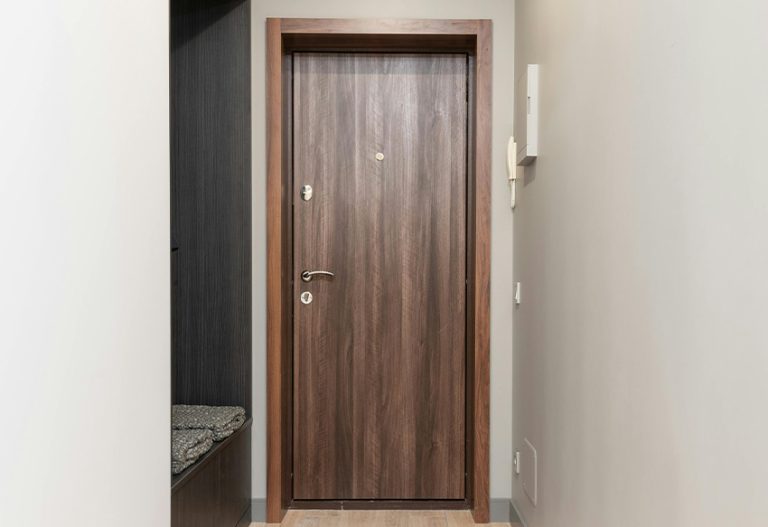 Flush door leaf and frame. Complete with fire seals and ironmongery.